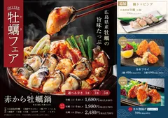 The main dish is an oyster nabe using seasonal oysters with increased flavor in winter when the weather gets colder, and you can also enjoy delicious spicy oyster dishes typical of Akakara.