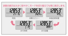 Even when switching modes, the number of steps is always displayed in large letters in the upper row, making it easy for seniors to read.