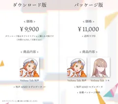 The package version includes another talk voice library ("VoiSona Talk Tomo") as an exclusive bonus. Additionally, both the package version and download version (purchase plan only) include a Chis-A MMD model data (product visual ver.) as a purchase bonus.