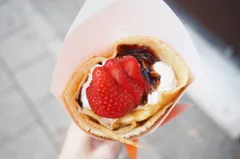 Crepe made with rice flour and strawberries: Crepe made with strawberries grown in Kyoto by a pastry chef with experience at a Michelin-starred restaurant.